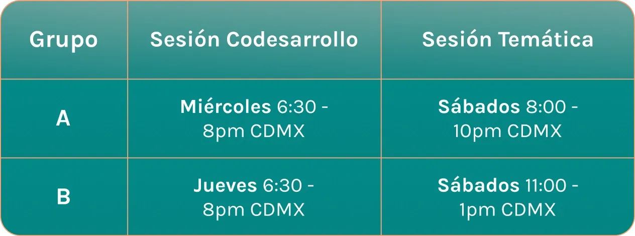 Cada semana tendrás una sesión temática en la que el mentor te comparte las enseñanzas centrales del módulo y una sesión de codesarrollo en la que compartes con el resto del grupo tus comprensiones, resuelves dudas y consolidas tus aprendizajes.